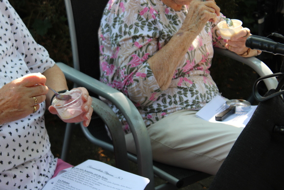 Für Dienstag waren sehr hohe Temperaturen angekündigt - da war eine Abkühlung dringend notwendig. So gab es kurzerhand eine kleine Eisbecher-Aktion draußen im Schatten, begleitet von Musik durch unsere Ehrenamtliche Frau Helga Möseler.